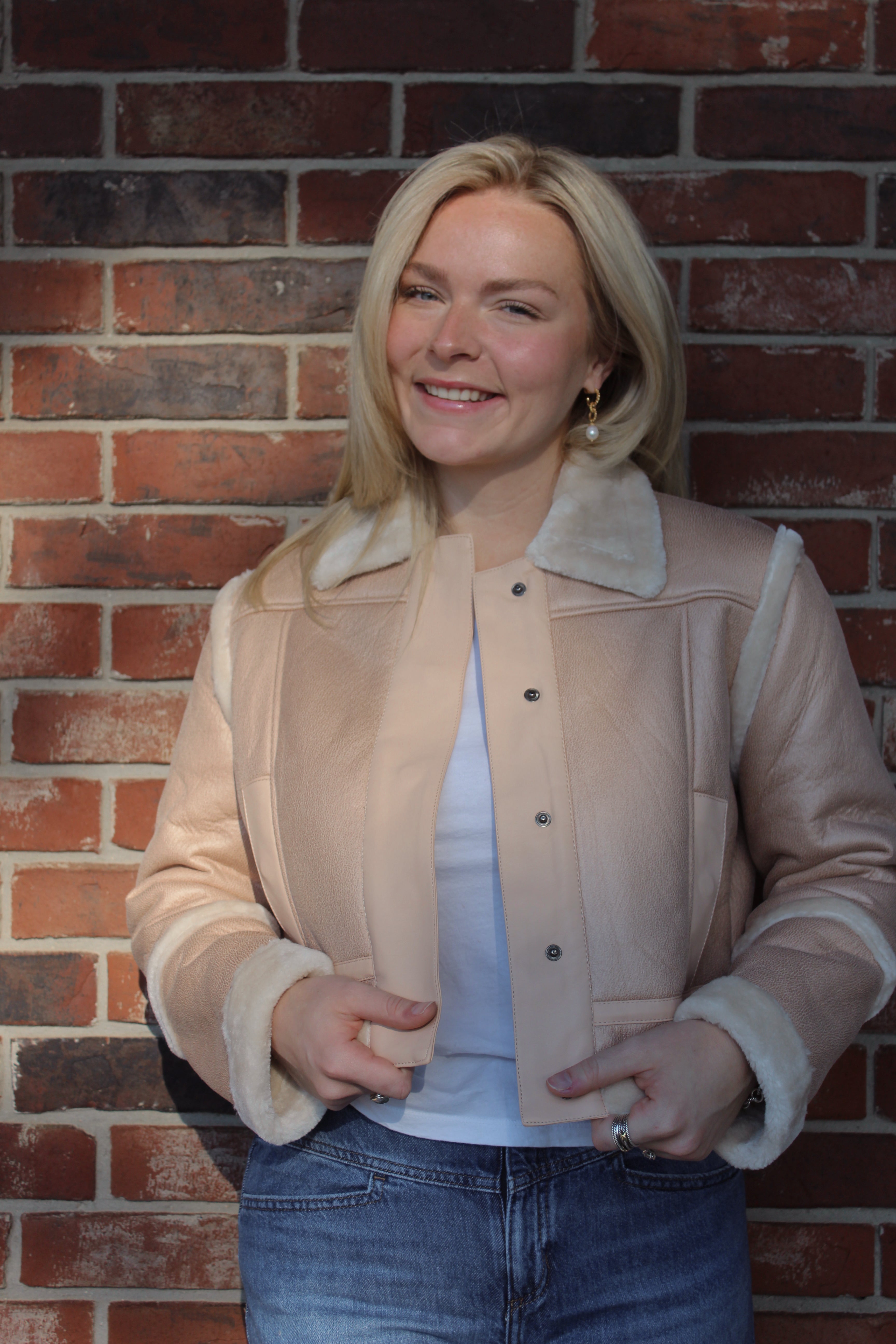 French Connection | Belen Faux Fur Cropped Moto Jacket, Toasted Almond/Classic Cream